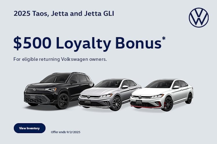 $500 Loyalty Bonus Disclaimer: *Volkswagen of America, Inc. will apply a $500 Loyalty Bonus when eligible returning Volkswagen owners who currently own or lease a model year 2015 or newer Volkswagen vehicle (proof of ownership/registration is required) lease or purchase a new, unused 2025 Jetta, Jetta GLI, or Taos through participating dealers from July 1, 2025 to September 2, 2025. No trade-in required. Offer valid only for current owner of qualifying Volkswagen vehicle, or family member residing at same address (proof of residency may be required). Offer is non-transferable. Limit one incentive per eligible VIN. Loyalty Bonus not available on Volkswagen Financial Services Lease programs exceeding 36 months, or Wells Fargo APR programs exceeding 72 months, and is not redeemable for cash. Bonus cannot be combined with Fleet or Dealership Sale Program vehicles. Corporations, companies, businesses, and dealers, fleet leasing, fleet management or dealer-affiliated fleet companies are not eligible. See your participating Volkswagen dealer for details or, for general product information, call 1-800-Drive-VW. ©2025 Volkswagen of America, Inc. Tax, title, tags and $989 processing fee are not included in the vehicle prices shown and must be paid by the purchaser.