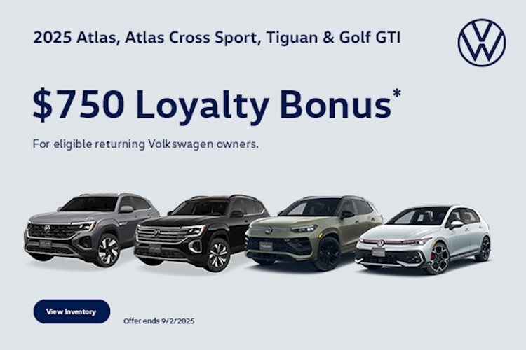 $750 Loyalty Bonus Disclaimer: *Volkswagen of America, Inc. will apply a $750 Loyalty Bonus when eligible returning Volkswagen owners who currently own or lease a model year 2015 or newer Volkswagen vehicle (proof of ownership/registration is required) lease or purchase a new, unused 2025 Atlas, Atlas Cross Sport, Tiguan and Golf GTI through participating dealers from July 1, 2025 to September 2, 2025. No trade-in required. Offer valid only for current owner of qualifying Volkswagen vehicle, or family member residing at same address (proof of residency may be required). Offer is non-transferable. Limit one incentive per eligible VIN. Loyalty Bonus not available on Volkswagen Financial Services Lease programs exceeding 36 months, or Wells Fargo APR programs exceeding 72 months, and is not redeemable for cash. Bonus cannot be combined with Fleet or Dealership Sale Program vehicles. Corporations, companies, businesses, and dealers, fleet leasing, fleet management or dealer-affiliated fleet companies are not eligible. See your participating Volkswagen dealer for details or, for general product information, call 1-800-Drive-VW. ©2025 Volkswagen of America, Inc. Tax, title, tags and $989 processing fee are not included in the vehicle prices shown and must be paid by the purchaser.